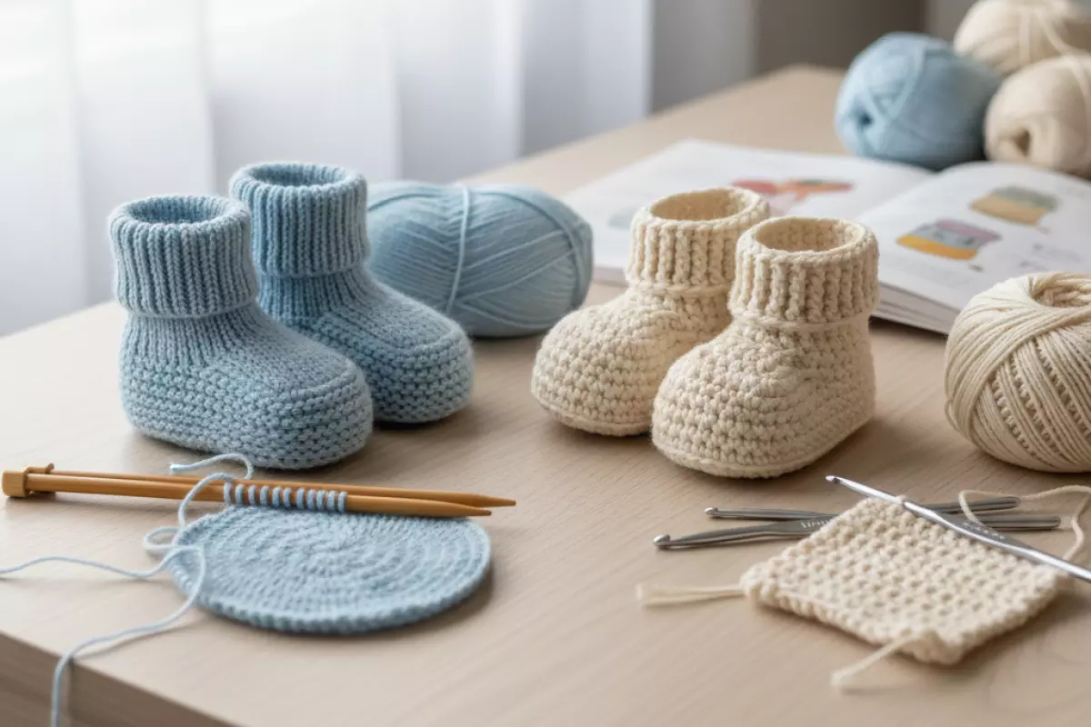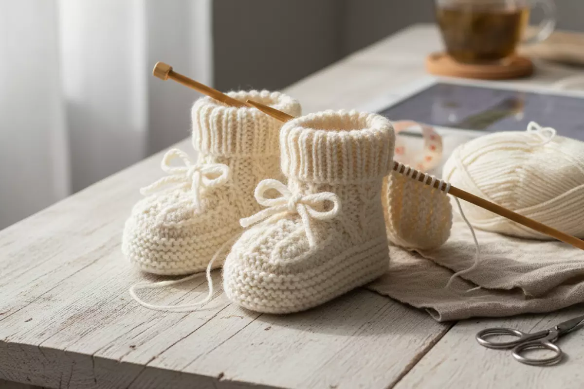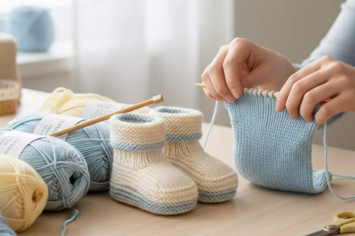 | Смесь «шерсть + акрил» | Теплее, чем хлопок, и практичнее, чем 100% шерсть | При низком качестве может быть жестковата | Зимние пинетки с хорошей посадкой |