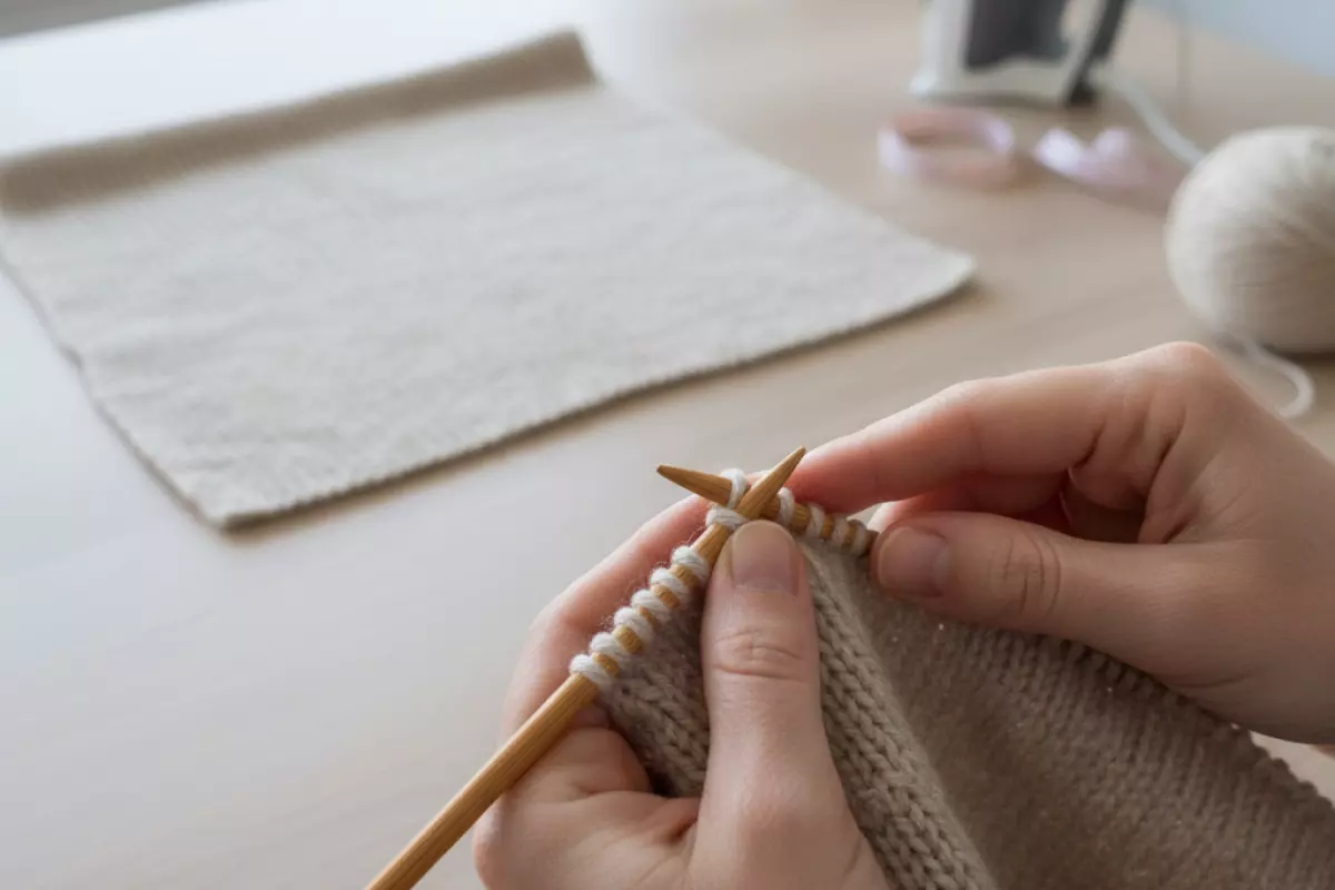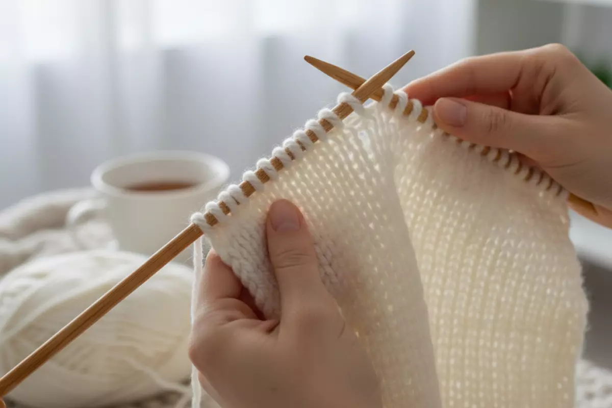 | Платочная вязка | Не закручивается, легко считать ряды, быстро вырабатывается ровный ритм | Следить за одинаковыми кромками, не затягивать первую петлю ряда | Тем, кто хочет «просто и аккуратно» |