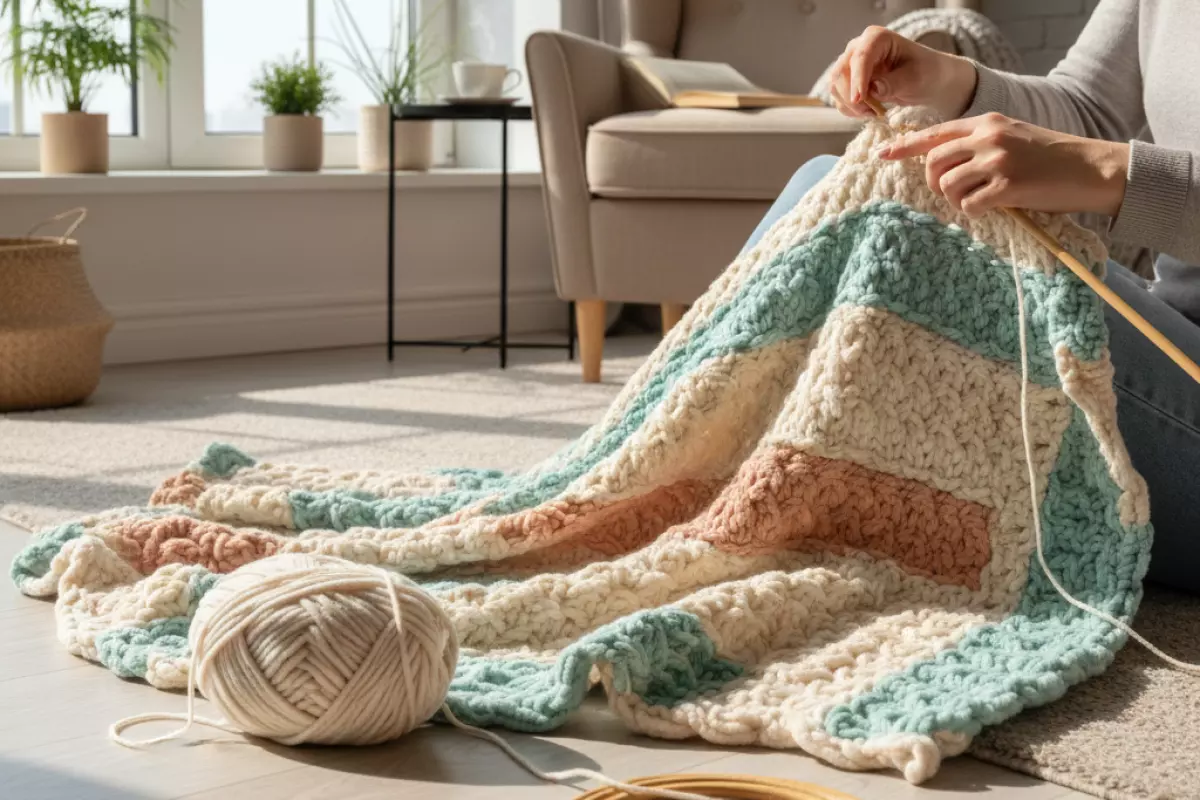 | Плед из пряжи-петелек (без спиц и крючка) | Руки | Не нужно осваивать петли, работа очень наглядная | Важно не перекручивать петли и держать одинаковое натяжение | Для быстрого результата за 1–2 вечера |