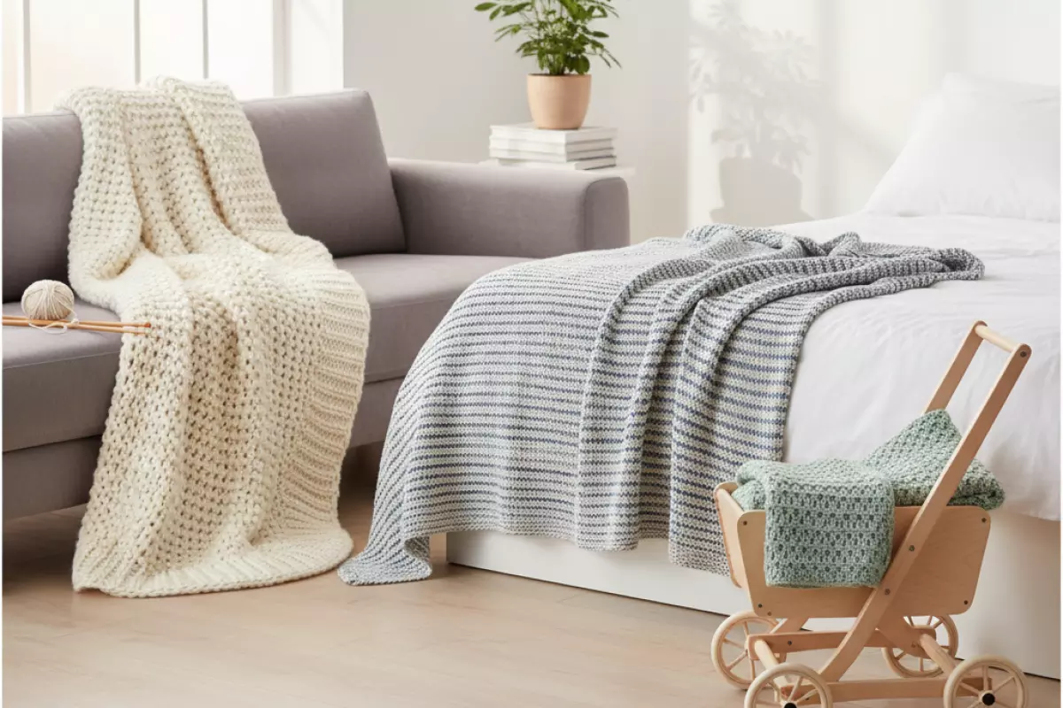 Сначала решите, где и как вещь будет использоваться: на диване, в кровати, в коляске или как накидка на плечи. От этого зависит не только длина и ширина, но и практичные детали — вес, плотность, насколько удобно стирать и как быстро полотно сохнет.