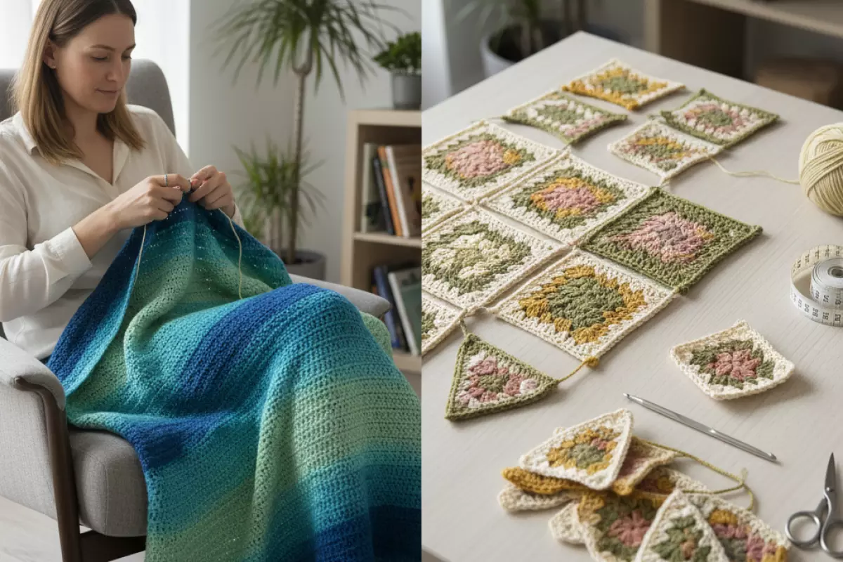 | Полустолбики (плотное полотно) | Крючок | Быстро растёт, выглядит аккуратно и «тёпло» | Может получиться тяжеловатым — выбирайте пряжу полегче | Для пледов на диван и пикник |