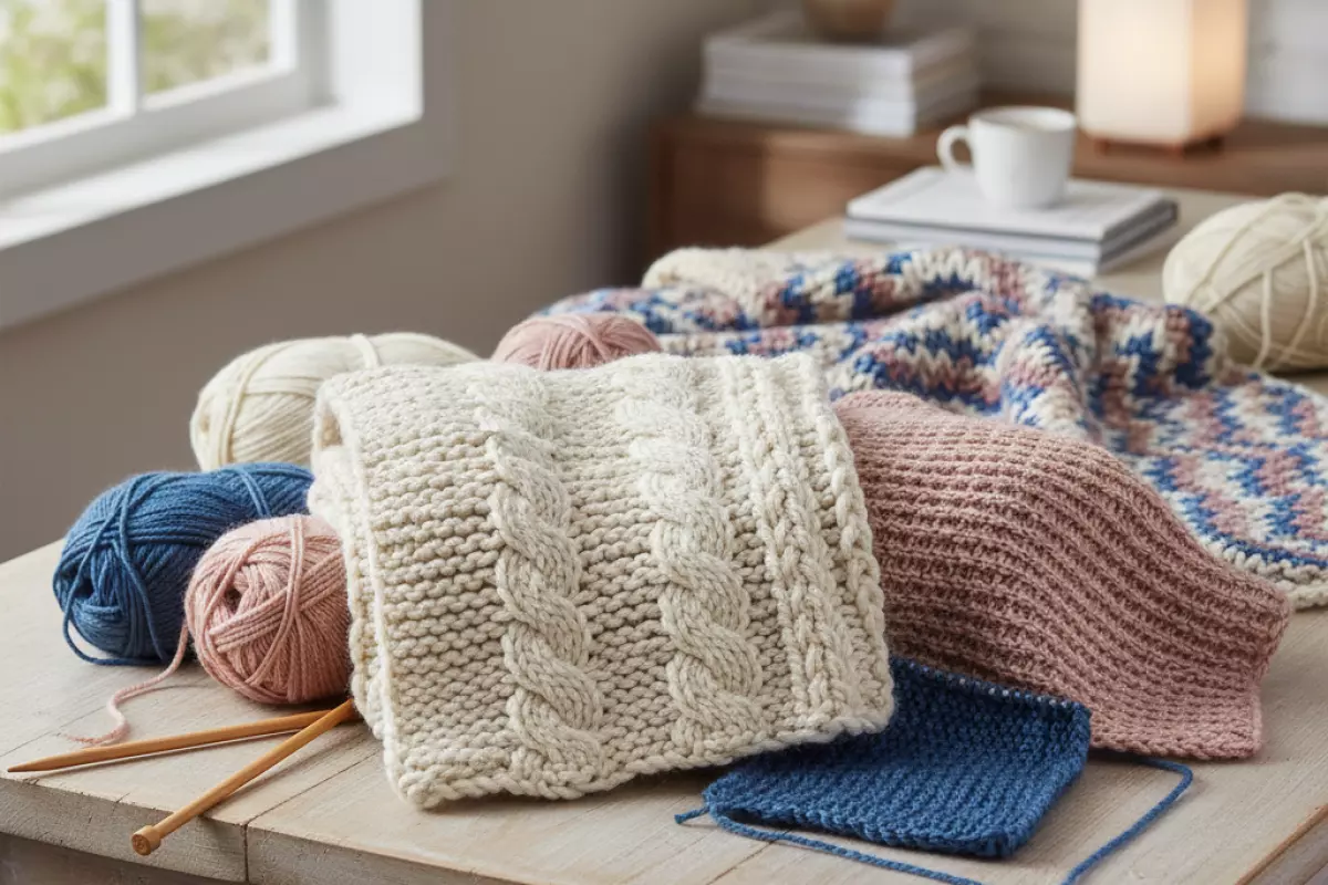 | Акрил | Легкий, бюджетный, много цветов, обычно неприхотлив в уходе | Может электризоваться, иногда скатывается, не всем приятен к коже | Детские и повседневные пледы, дачные варианты | Простая лицевая гладь, «бабушкин квадрат», крупные рельефы |