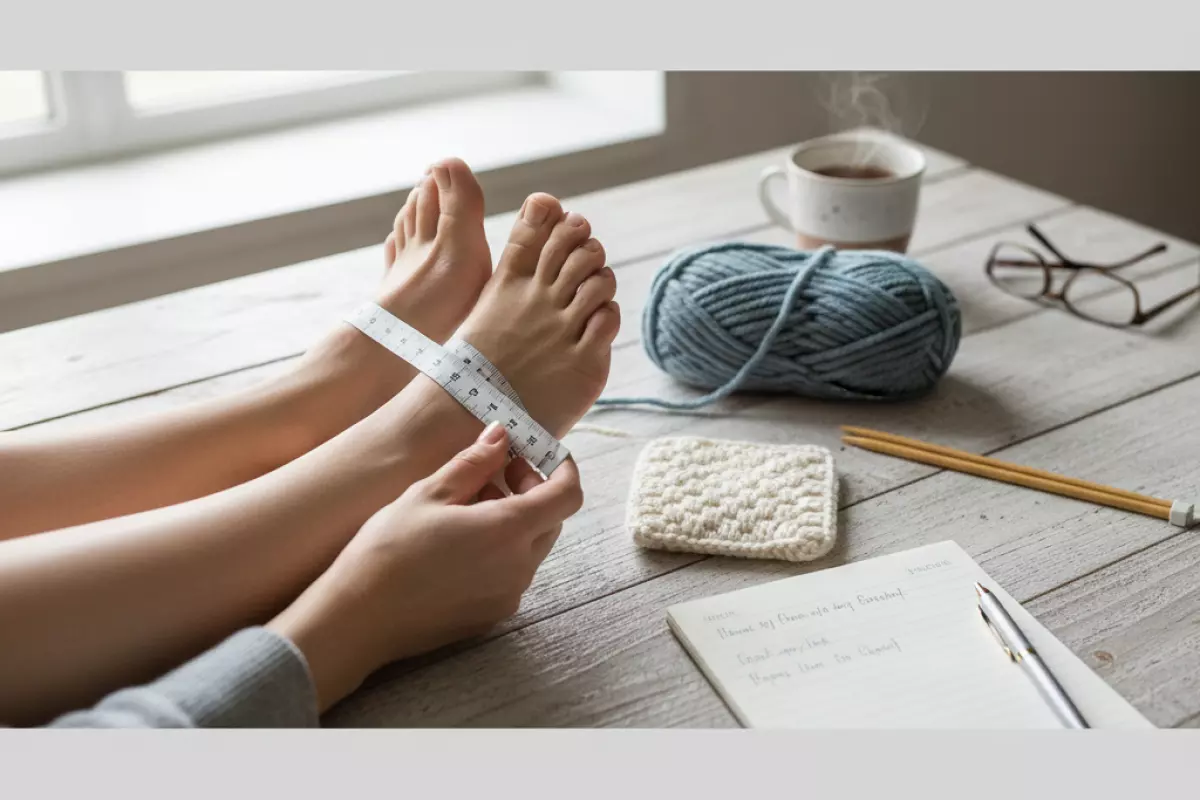 Точные мерки нужны, чтобы домашняя пара не жала в носке и не слетала с пятки. Снимайте их вечером или после небольшой прогулки: к этому времени нога обычно чуть больше, и посадка получится комфортнее.