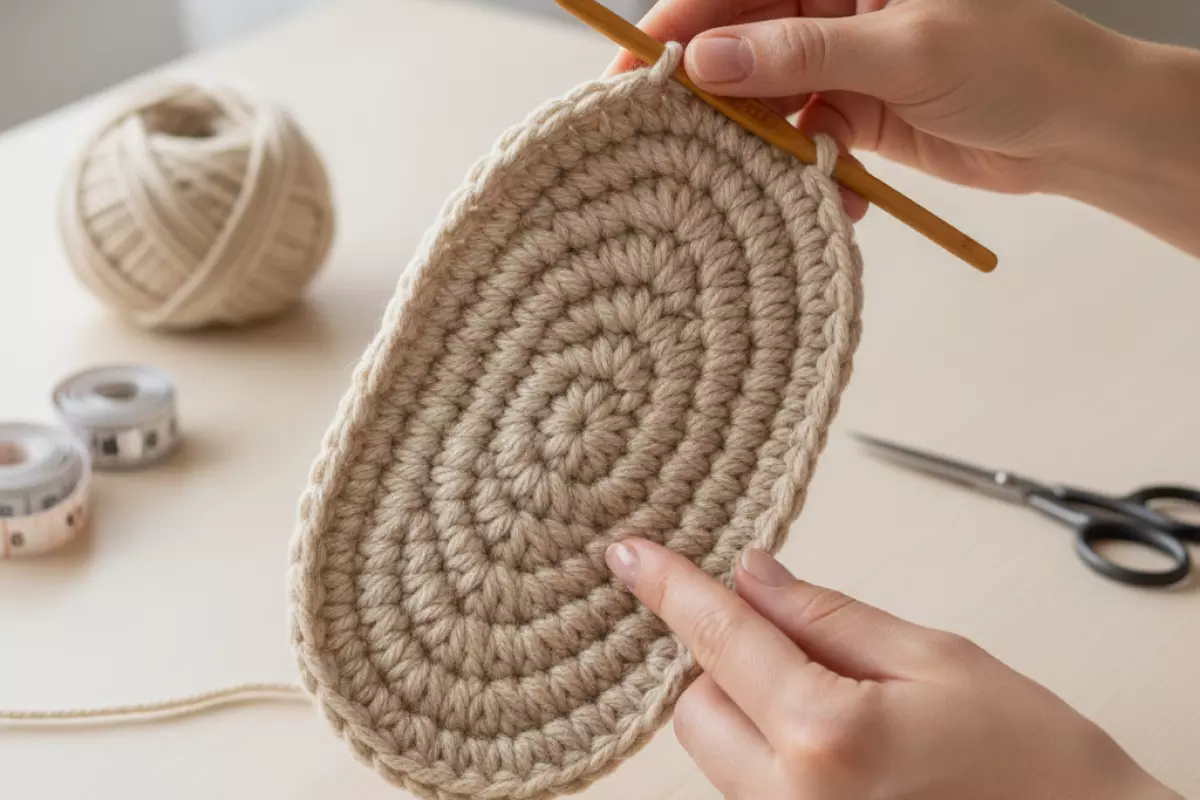 В конце спрячь концы нитей по изнанке, пройдись по краю обвязкой (например, «рачьим шагом») и сделай финальную примерку: тапочка должна держаться на ноге без давления на пальцы и подъём.