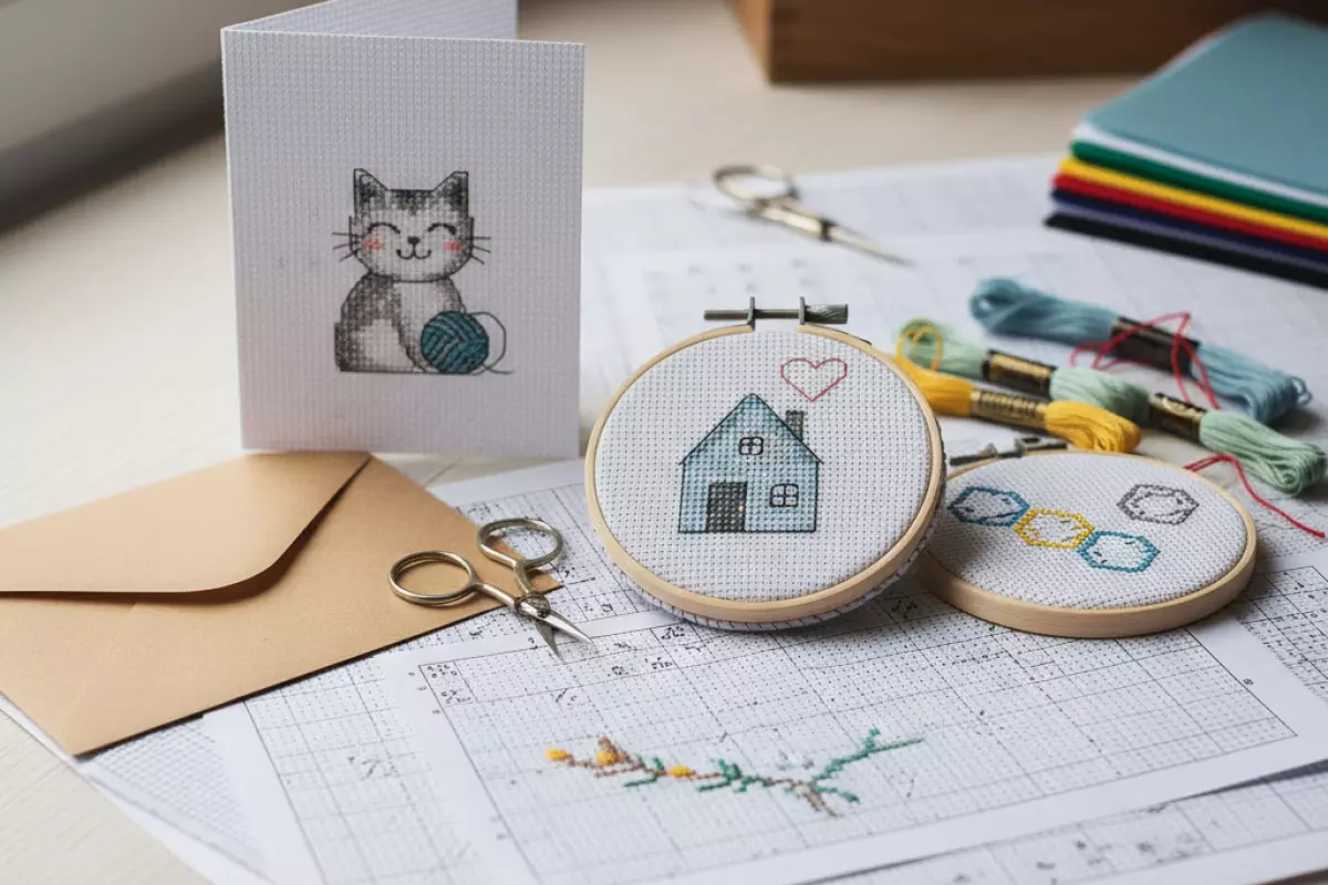 Для первых работ удобнее брать мини-рисунки на 20–40 крестиков по стороне: их реально закончить за вечер-два и спокойно отработать базовые движения. Выбирай сюжеты с крупными цветными пятнами и минимумом одиночных стежков — так проще держать ритм и не путаться в счёте.