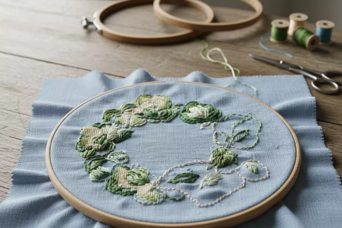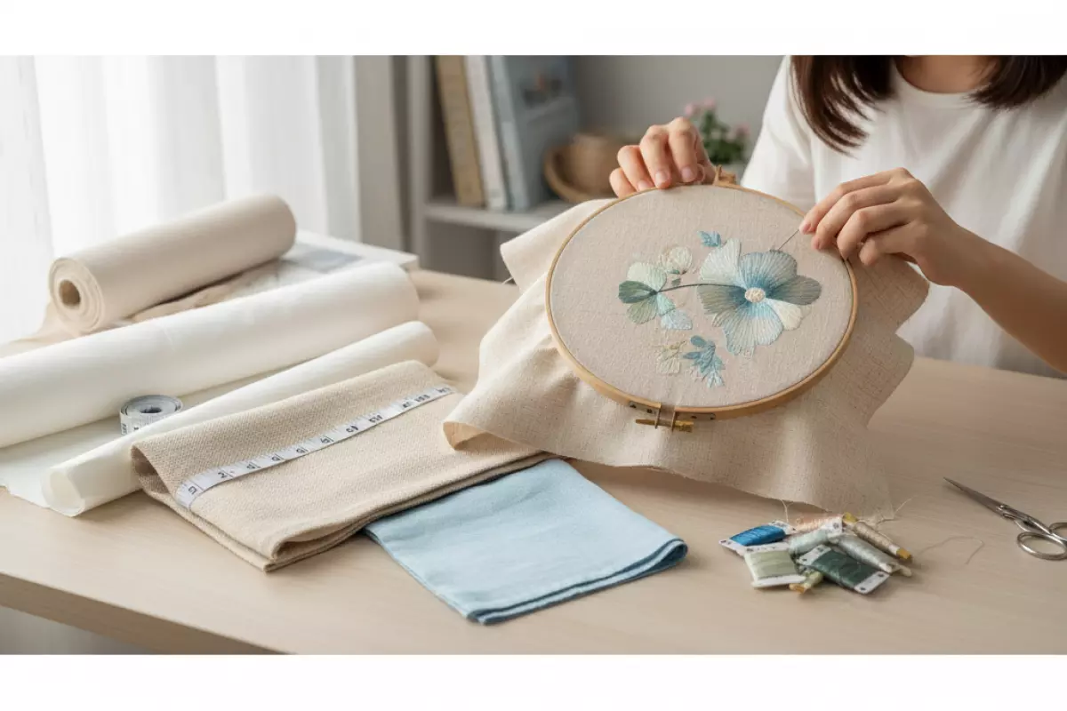 Основа для вышивки должна держать стежок и не «плыть» под натяжением пялец. Проще всего работать с материалами, где нити переплетены равномерно: рисунок получается аккуратнее, а контуры не ведёт. Для первых работ выбирайте светлую ткань средней плотности — на ней легче контролировать длину стежков и плотность заполнения.
