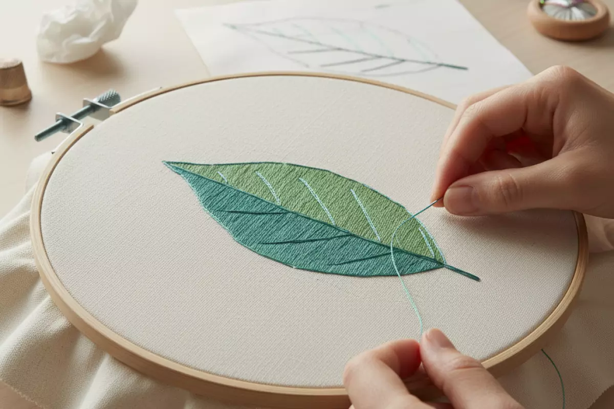 - Маленькая веточка с 2–3 листиками — учит не перетягивать ткань на переходах.