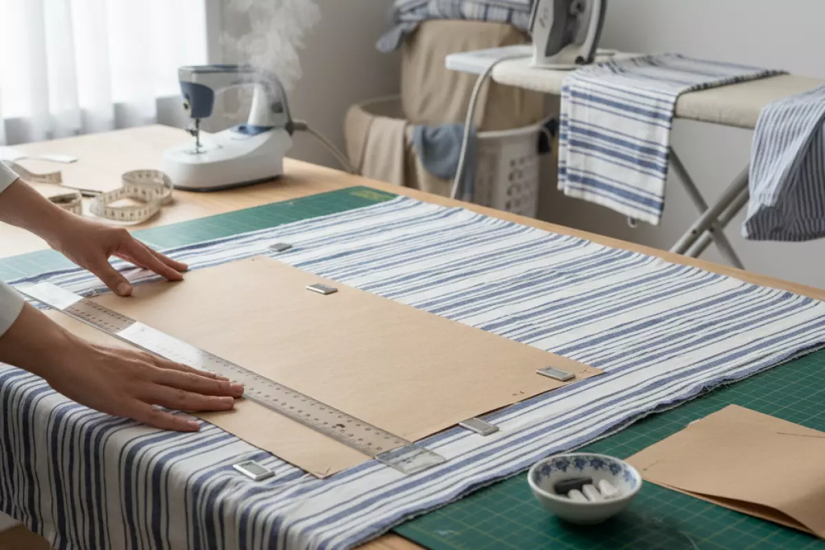 Сначала проверьте выкройку и разложите элементы на ткани так, как они будут располагаться в готовом изделии: лицом/изнанкой, направление долевой, рисунок и ворс. Если ткань в полоску или клетку, сразу решите, где будет «центр» узора, чтобы стороны не разъехались.