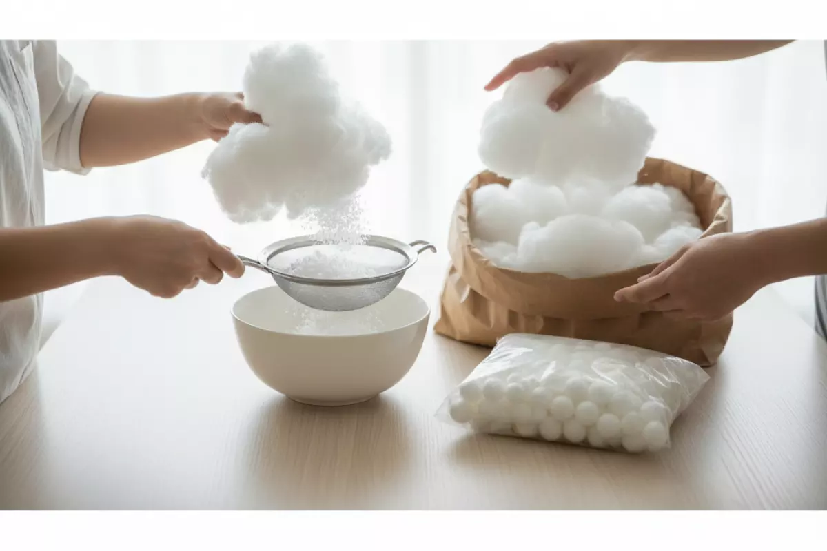 - Синтепух, холлофайбер (шарики/волокно) — разрыхлите руками, разберите слежавшиеся куски. Если есть запах от упаковки, оставьте на проветривание на 2–3 часа.