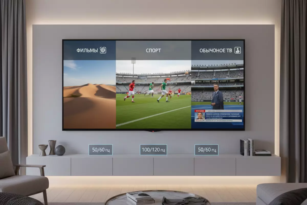 - 50/60 Гц — базовый вариант. Для новостей, сериалов, YouTube и обычных передач обычно хватает, если не придираться к плавности на быстрых движениях.