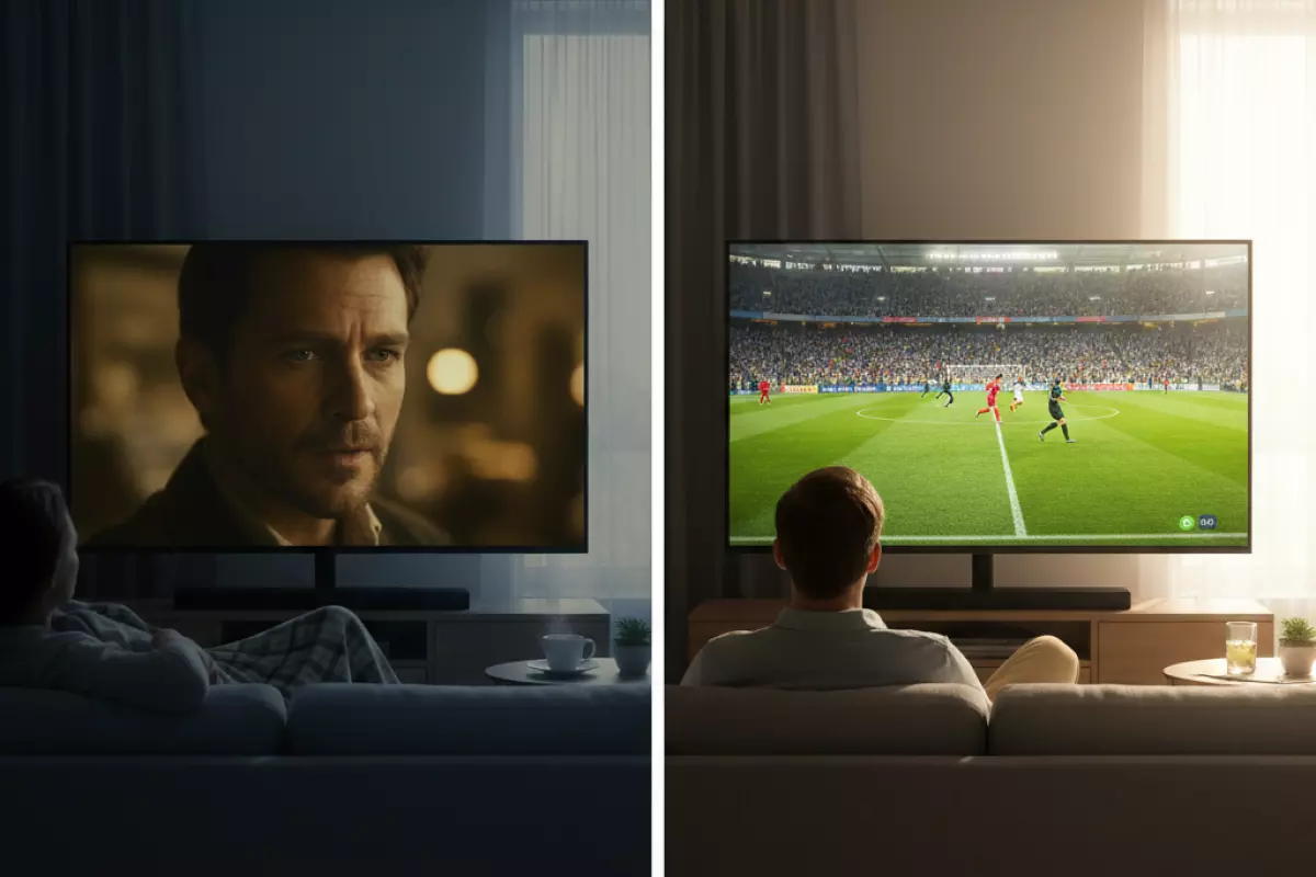 Днём телевизору приходится «пробиваться» через освещение комнаты и блики на экране, поэтому часто нужны более высокая яркость и чуть более агрессивная обработка. В тёмное время лишняя яркость уже не помогает — она утомляет, подчёркивает шум и делает чёрный серым.