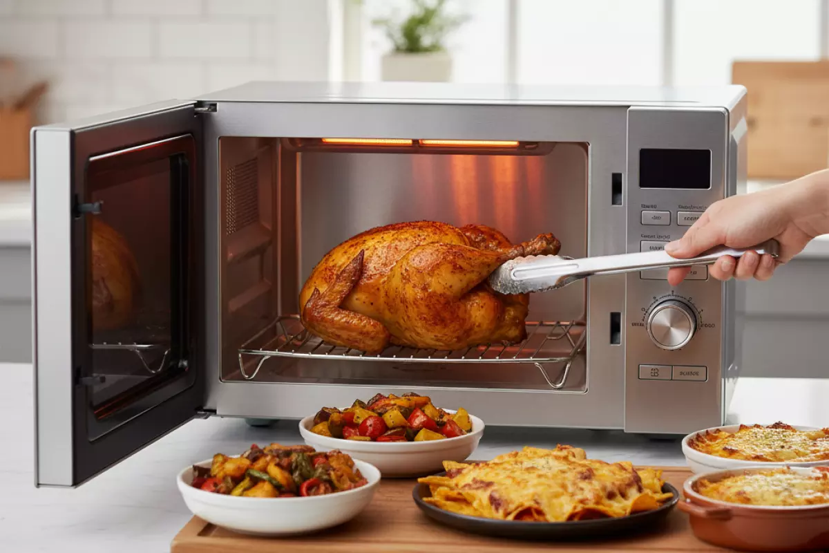 | Микроволны + конвекция | Ускоряет запекание, помогает пропекать крупные порции | Пироги, большие куски мяса, блюда в форме | Тем, кто часто готовит на семью и не любит пересушивание краев | Если готовите небольшими порциями и не печете |