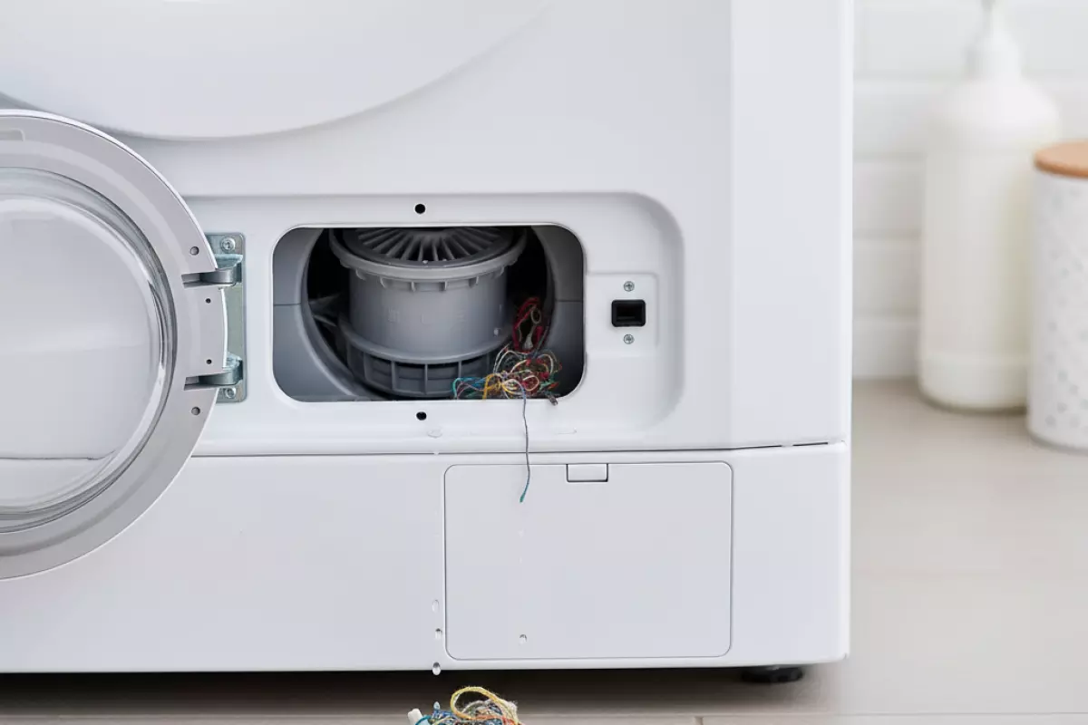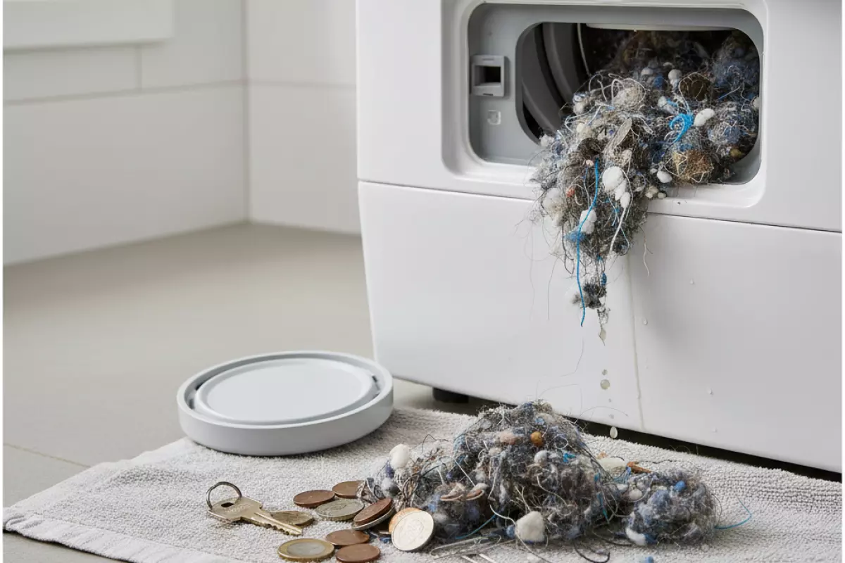 В сливном узле обычно скапливается всё, что «убежало» из карманов и отслоилось от вещей во время стирки. Сначала это кажется мелочью, но со временем мусор мешает нормальному оттоку воды, перегружает помпу и может провоцировать неприятный запах.