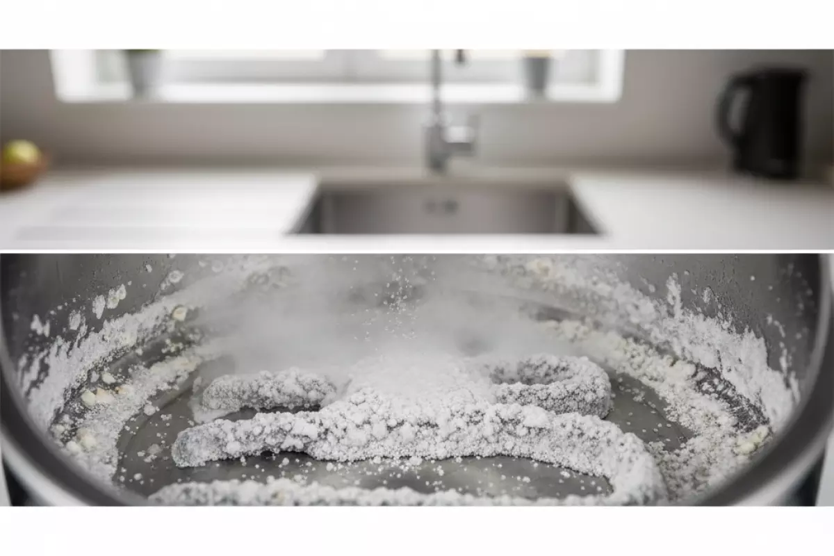 В быту это обычно проявляется так: после нескольких кипячений на дне появляется «песочек», вода может выглядеть слегка мутной, а со временем налёт превращается в твёрдую корку. Это не «грязь из чайника», а минералы, которые были в воде изначально.